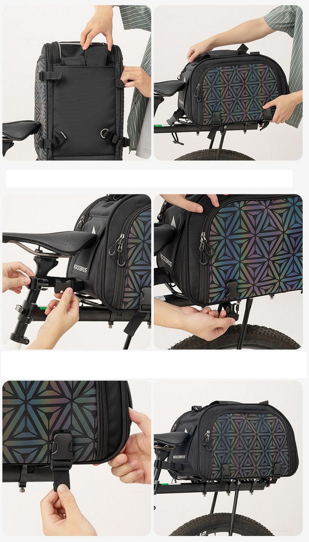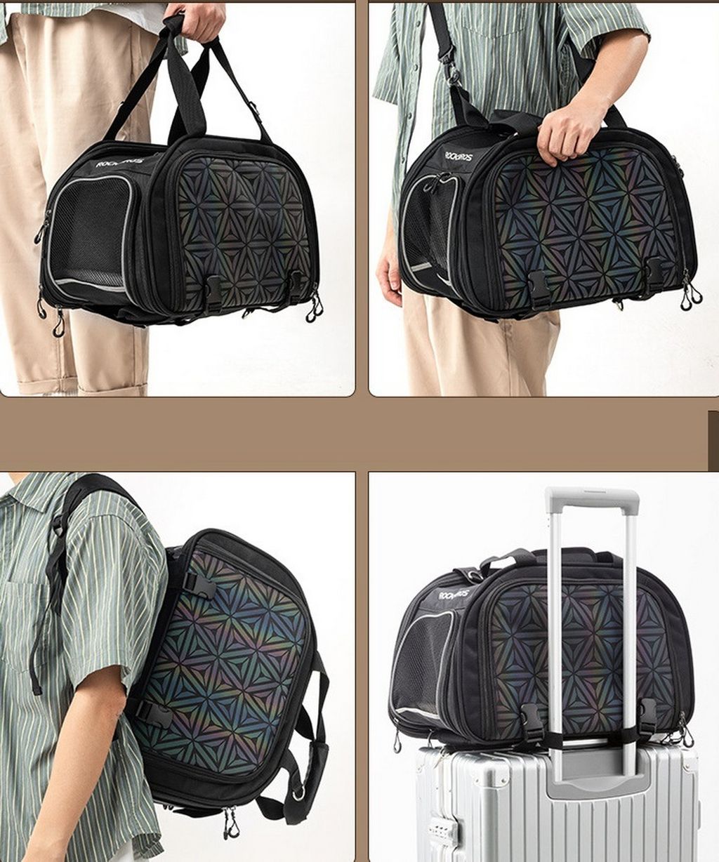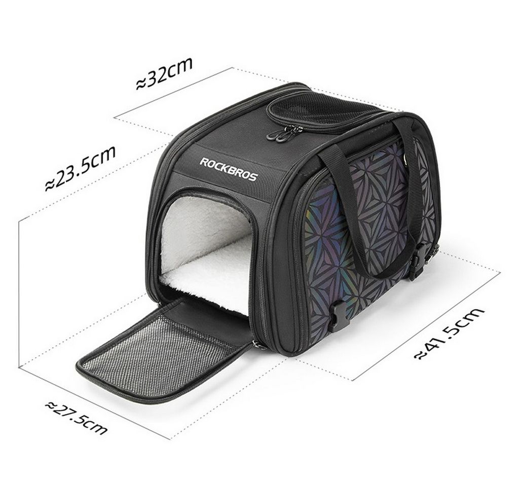 Велосипедная сумка для перевозки вашего питомца, сумка с помощью ремней к вело багажнику, также сумку можно носить как рюкзак или на плече. Внутри сумки 3 мягких съемных мата, которые можно снять и постирать. Боковые стенки раскладываются (смотри фото) для увеличения пространства.