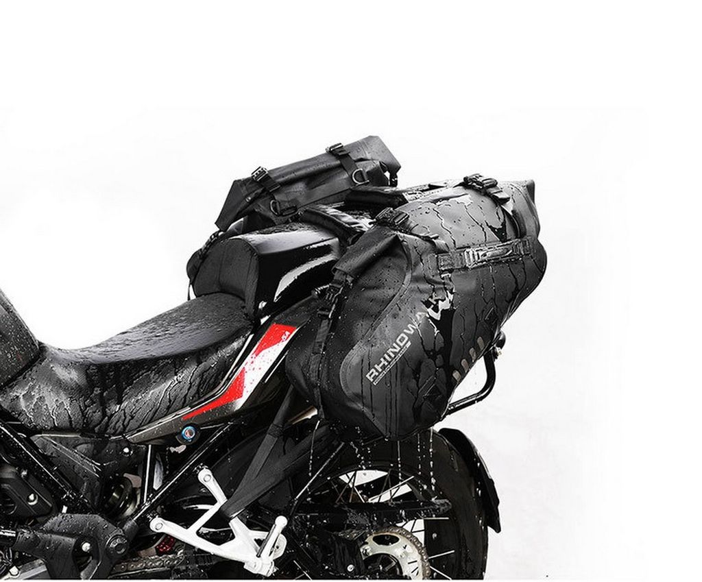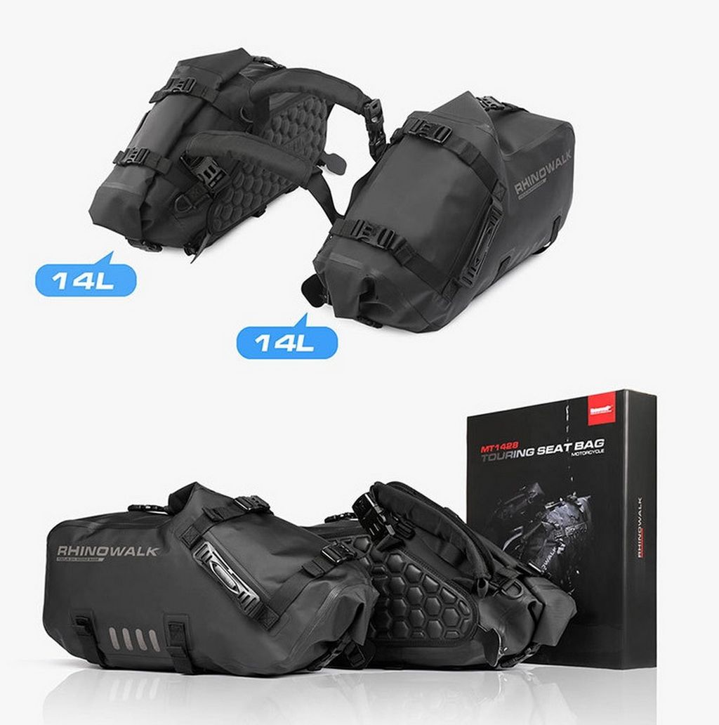 Двойная мото сумка Rhinowalk для мото путешественников, парные сумки имеют общий объем 48 л, выполнены из водонепроницаемого материала, им не страшен не дождь не гряз, на сумки имеются дополнительные крепления для перевозки различного снаряжения. Также сумку можно носить отдельно, в комплекте имеется лямка на плече. На внутренней части имеются 3D вставки выдерживающие температуру до 180 градусов.
