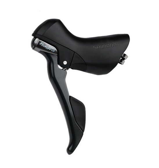 Шоссейные манетки (пистолеты) или же дуалы Shimano Tiagra ST-4700. Выполняют сразу две функции: нажатие на рычаг обеспечивает торможение, отклонение в сторонку - заброс цепи на большую звезду, а нажатие на небольшой рычажок скидывает цепь на позицию ниже. Эргономичная форма с изгибом повышает комфорт при катании.