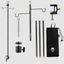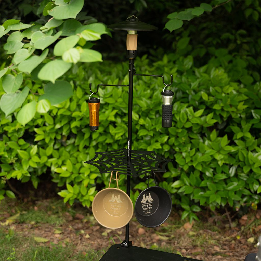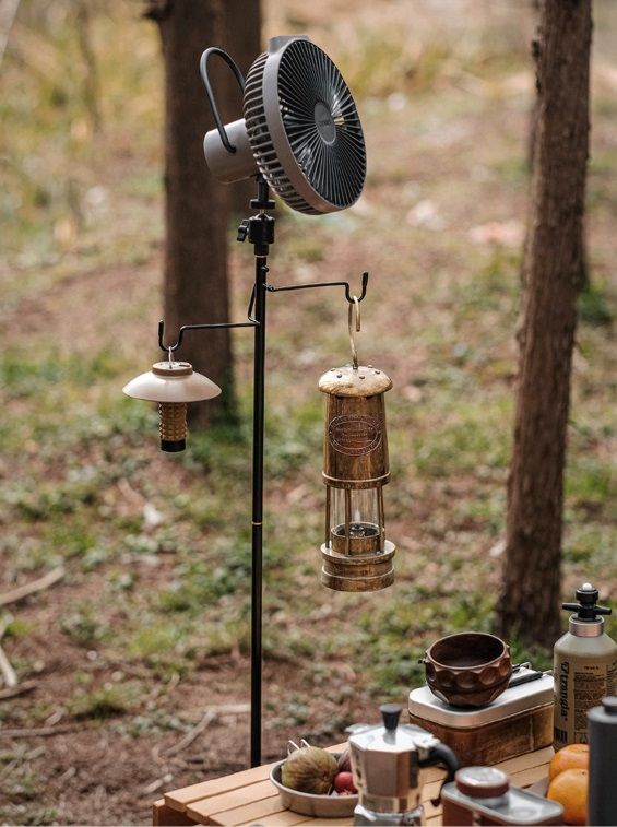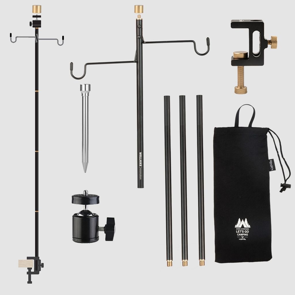 Кронштейн можно установить на край стола с помощью зажима или воткнуть в землю, на кронштейне имеется 2 крючка и резьба фонари, вентиляторы или камеру.