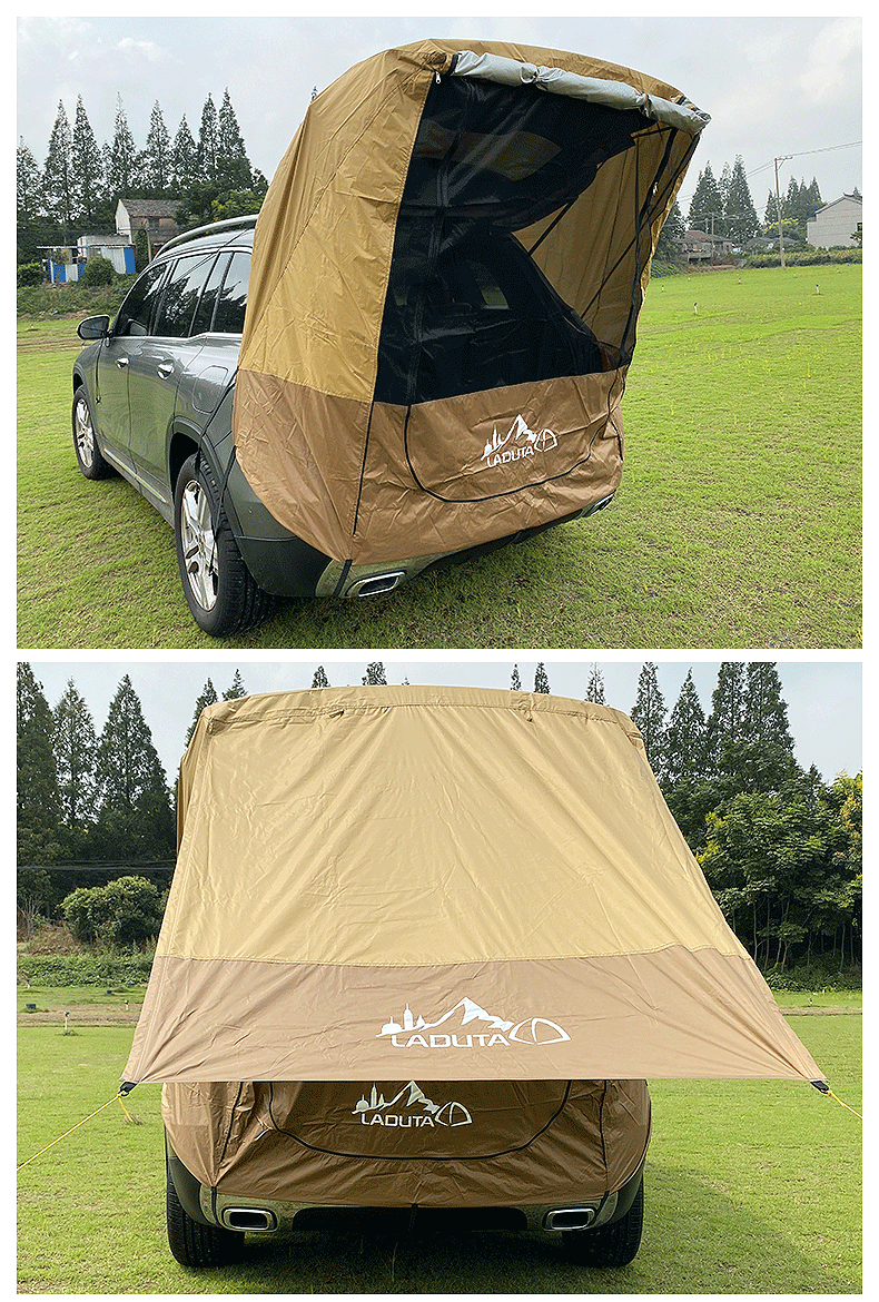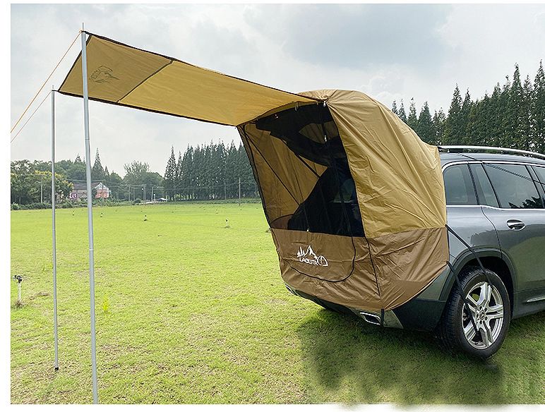 Тент палатка на заднюю дверь автомобиля, тент устанавливается на авто с помощи тросов с крючками, тент имеет козырек и дверь с москитной сеткой, дынный дивайс позволяет сделать вашу машину полноценной палаткой.
