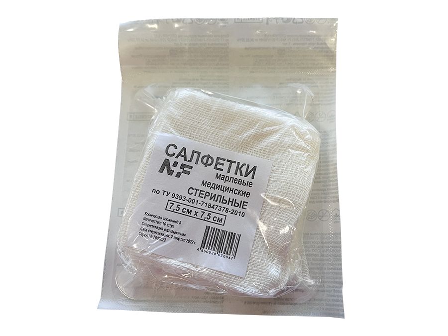 Салфетка 7,5*7,5 см марлевая медицинская, стерильная, 12 сложений, 10 штук/упаковка, Россия (ООО "Ньюфарм")