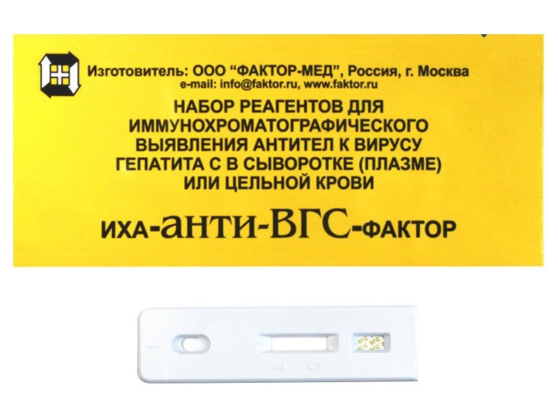 Набор реагентов ИХА-анти-ВГС-Фактор для иммунохроматографического выявления антител к вирусу гепатита С в сыворотке (плазме) или цельной крови, 25 анализов, Россия (Фактор-Мед Продакшн)