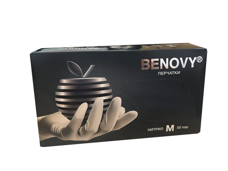Перчатки медицинские диагностические (смотровые) одноразовые нестерильные "Benovy" нитриловые текстурированные на пальцах, неопудренные с однократной хлоринацией (манжета с валиком), цвет белый, размер M, 50 пар/упаковка, Китай (ООО "Бинови")