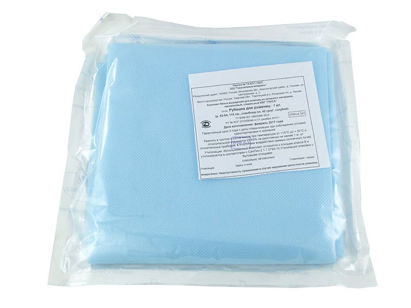 Рубашка для роженицы нестерильная, материал спанбонд, плотность 25 г/м2, рр 48-54, 5 штук/упаковка, Россия (ООО "Ньюфарм")