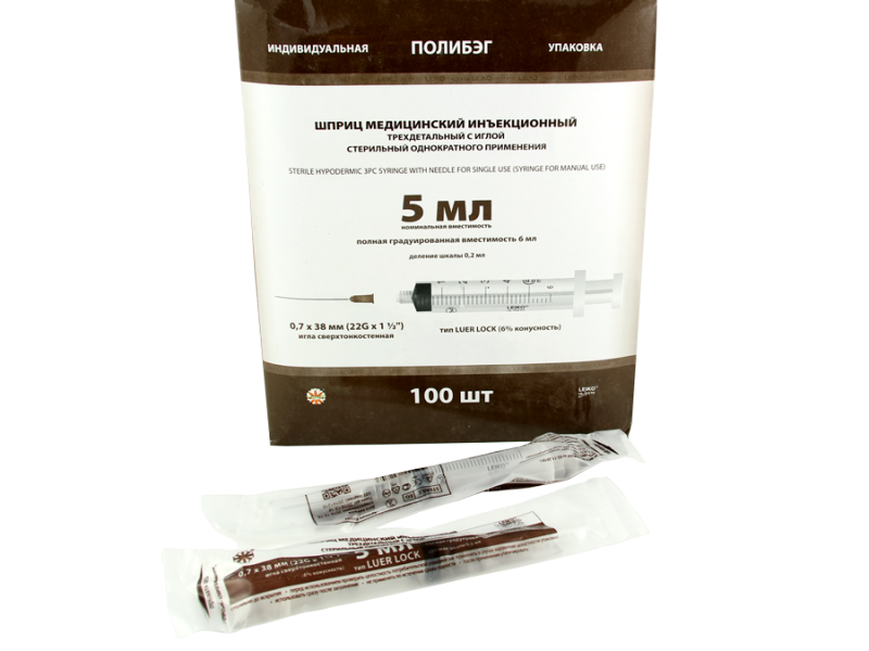 Шприц Leiko 5 мл с иглой 22G*1 1/2" (0,7*38 мм, Луер-Лок) медицинский инъекционный стерильный однократного применения, 100 шт/упаковка, Китай (Changzhou Shuangma Medical Devices Co., Ltd.), 523244