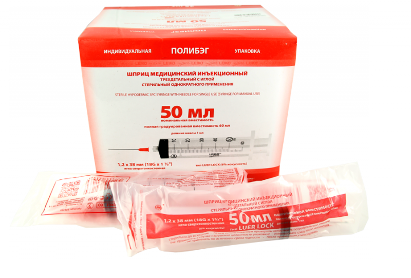 Шприц Leiko 50 мл с иглой 18G*1 1/2" (1,2*38 мм, Луер-Лок) медицинский инъекционный стерильный однократного применения, 25 шт/упаковка, Китай (Changzhou Shuangma Medical Devices Co., Ltd.) 523286
