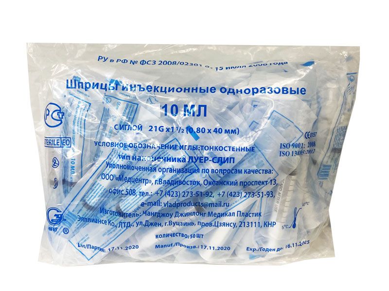 Шприц 10 мл (см3) с иглой 21Gх1 1/2 (0,8*40 мм) одноразовый стерильный, соединение луер-слип, 50 шт/упаковка, П/Э, Китай (Changzhou Jinlong Medical Plastic Appliance Co. Ltd.)