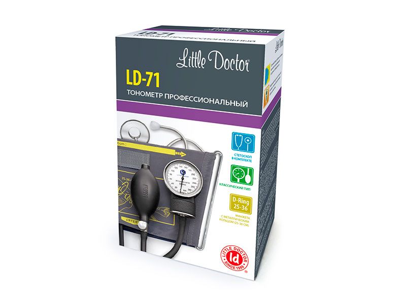 Механический тонометрLittle Doctor LD-71классического типа, предназначен для измерения артериального давления методом Короткова и снятия показаний на манометре.