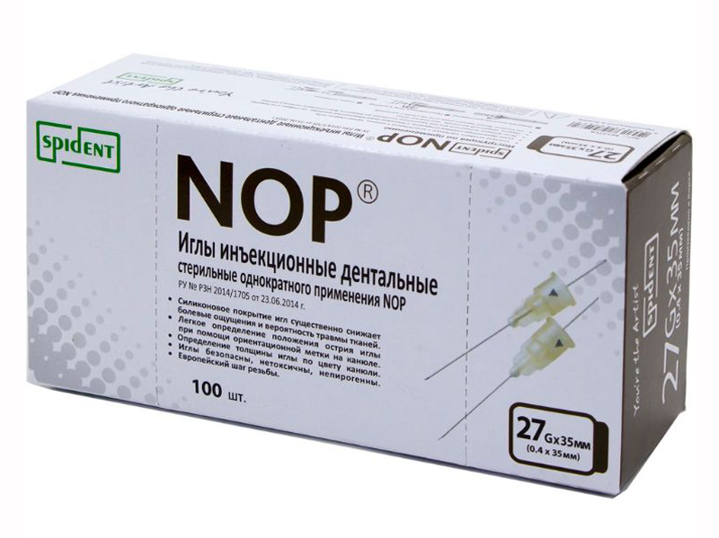 Игла инъекционная одноразовая NOP, карпульная размер 0,4х35 мм (27G), европейский стандарт,100 штук/упаковка, Корея (Spident)