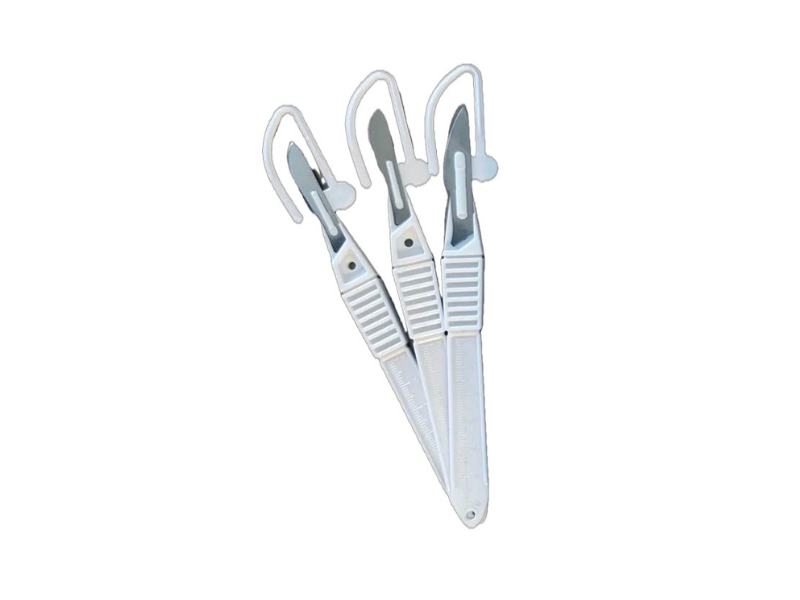Лезвие скальпеля имеет прозрачный жесткий защитный чехол.
