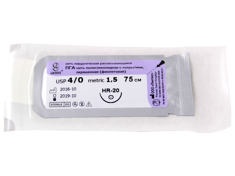 ПГА плетеный фиолетовый МР(1,5), USP(4/0), длина 75 см, игла колющая HR-20, 1/2 окружности, Россия (ООО "Линтекс") 11015A200750