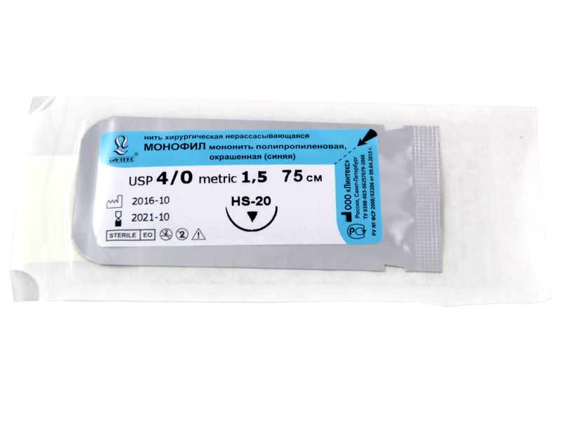 Монофил синий МР(1,5), USP(4/0), длина 75 см, игла обратно-режущая HS-20, 1/2 окружности, Россия (ООО "Линтекс") 13215B200750