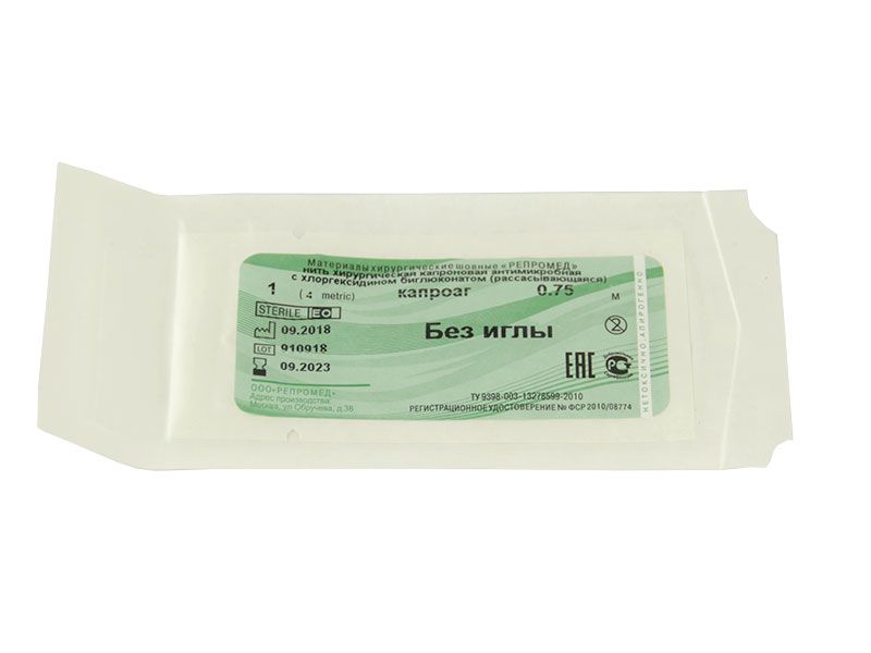 Капроаг (нить хирургическая капроновая антимикробная с хлоргексидином биглюконатом) EP(4), USР(1), длина 75 см, без иглы, Россия (ООО "Репромед")