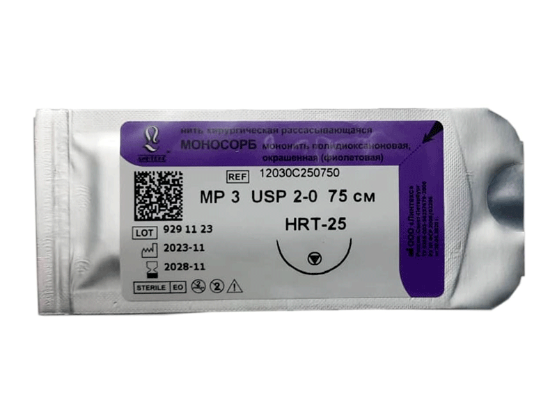 Моносорб фиолетовый, МР(3) USP(2/0), длина 75 см, игла колюще-режущая HRT-25, 1/2 окружности, Россия (ООО "Линтекс") 12030C250750