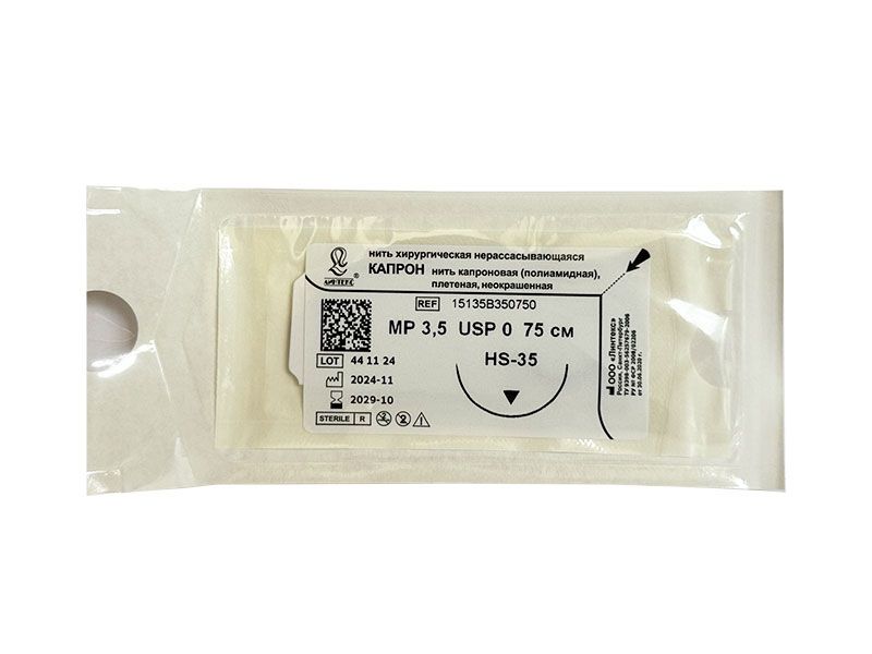 Капрон плетеный неокрашенный МР(3,5), USP(0), 75 см, игла обратно-режущая HS-35, 1/2 окружности, Россия (ООО "Линтекс") 15135B350750