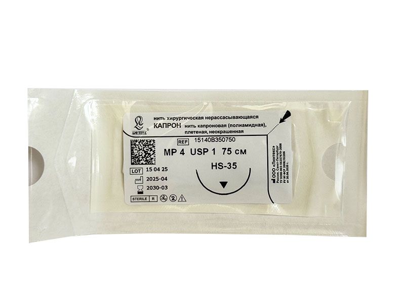 Капрон плетеный неокрашенный МР(4), USP(1), 75 см, игла обратно-режущая HS-35, 1/2 окружности, Россия (ООО "Линтекс") 15140B350750