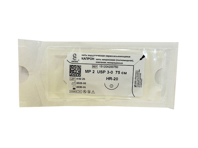 Капрон плетеный неокрашенный МР(2), USP(3/0), 75 см, игла колющая HR-20, 1/2 окружности, Россия (ООО "Линтекс") 15120A200750