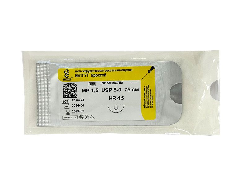 Кетгут простой МР(1,5), USР(5/0), длина 75 см, игла колющая HR-15, 1/2 окружности, Россия (ООО "Линтекс") 17015A150750