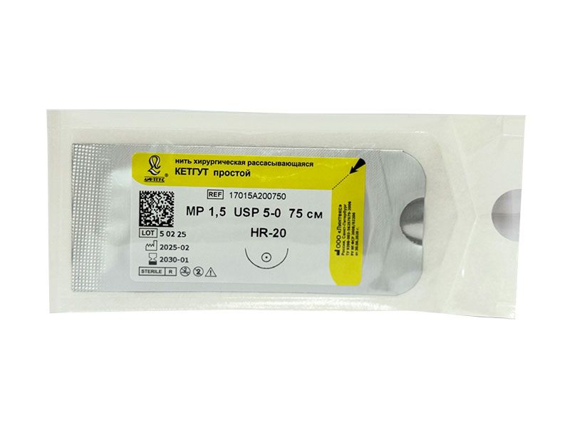 Кетгут простой МР(1,5), USР(5/0), длина 75 см, игла колющая HR-20, 1/2 окружности, Россия (ООО "Линтекс") 17015A200750
