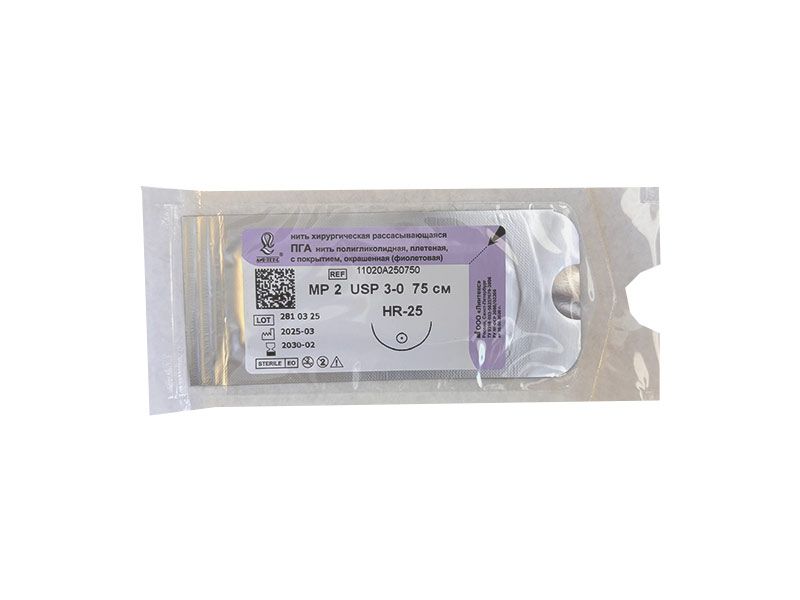 ПГА плетеный фиолетовый МР(2), USP(3/0), длина 75 см, игла колющая HR-25, 1/2 окружности, Россия (ООО "Линтекс") 11020A250750