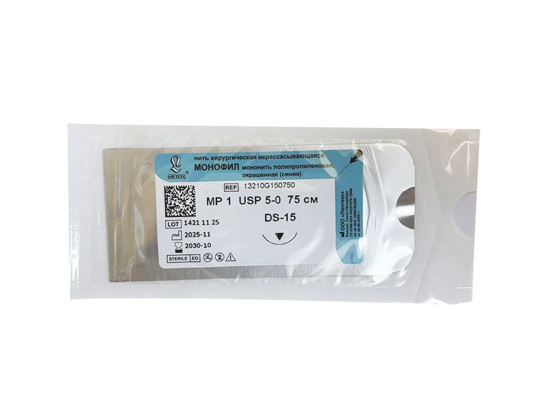 Монофил синий МР(1), USP(5/0), длина 75 см, игла обратно-режущая DS-15, 3/8 окружности, Россия (ООО "Линтекс") 13210G150750