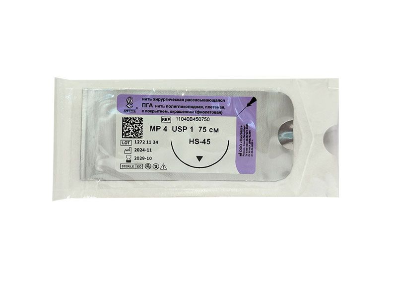 ПГА плетеный фиолетовый МР(4), USP(1), длина 90 см, игла колющая HR-45, 1/2 окружности, Россия (ООО "Линтекс") 11040A450900