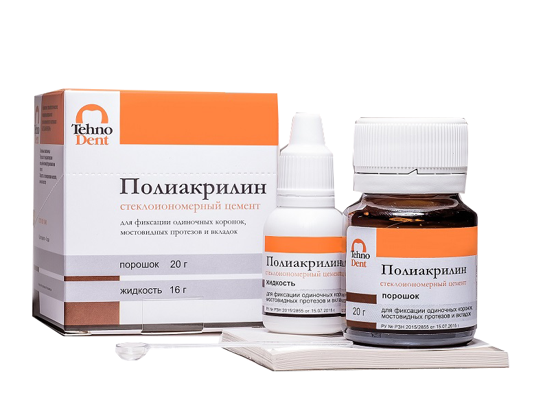 Полиакрилин-СИЦ комплект для фиксации одиночных коронок, мостовидных протезов и вкладок, 20 г порошок+16 г жидкость, Россия (ООО "ТехноДент") 021-01-020.016