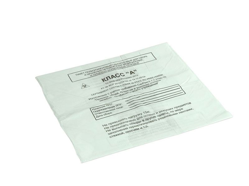 Пакет одноразовый двухслойный для сбора, хранения и утилизации медицинских отходов. Пакет состоит из двух слоев: внешний слой полиэтилен высокого давления 30%; внутренний слой полиэтилен низкого давления 70%. Цвет соответствует цветовой кодировке отходов класса А, Б, В, Г. Спаечный шов располагается по ширине пакета, боковой шов отсутствует. Ширина шва 1,5 мм. Прочность сварного шва при разрыве составляет не менее 70% от прочности пленки. На пакете располагается информационное окно содержащее следующую информацию: класс отходов, название ЛПУ, дата выброса отходов, ФИО ответственного лица за выброс отходов. Информационное окно располагается по центру пакета и наносится флексографическим способом печати.