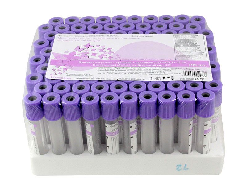 Цветовая кодировка пробирки – сиреневая или фиолетовая, стенки пробирок покрыты силиконом.