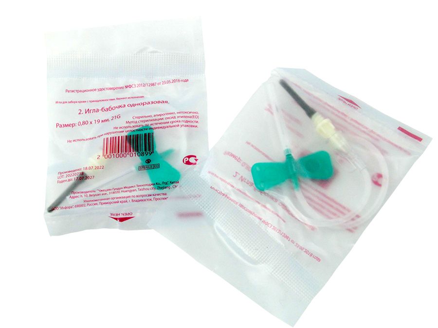 Игла-бабочка 21G*3/4, 0,8*19 мм с луер-адаптером (для вакуумного забора крови), длина 19 см., 100 штук/упаковка, Китай ("Zhejiang Gongdong Medical Technology Co., Ltd")