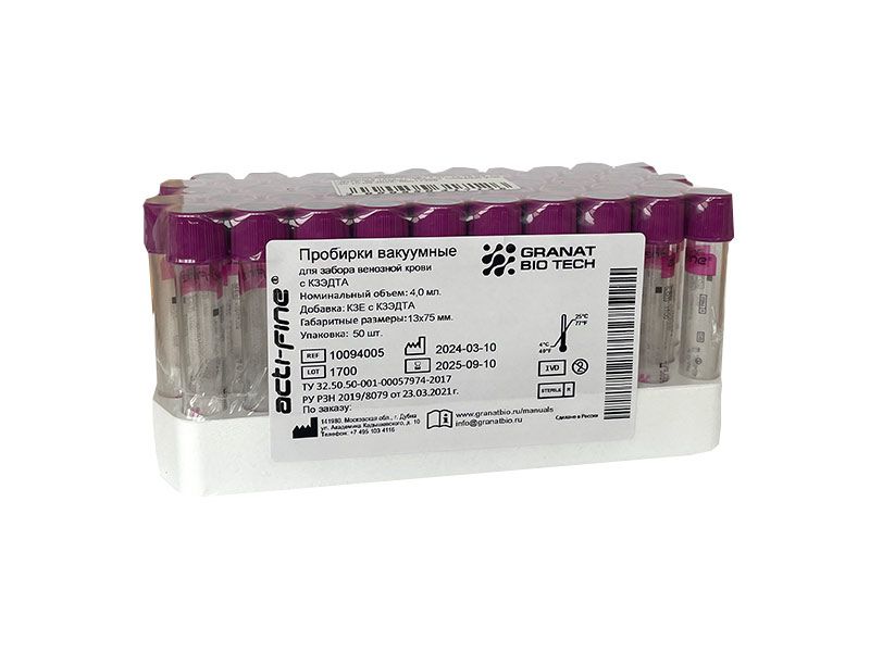Пробирка вакуумная для взятия венозной крови «Acti-Fine®» 4 мл, 13*75 мм, с К3 ЭДТА, 50 шт/упаковка, Россия (ООО "Гранат Био Тех") 10094005