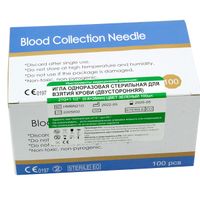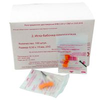 Предназначена для взятия крови у 'проблемных' пациентов, широко используется в педиатрии, ветеринарии и отделениях реанимации. Каждый комплект упакован в полиэтиленовую, герметично запаянную упаковку с маркировкой и инструкцией. Полная внутренняя стерильность. Игла изготовлена из нержавеющей стали, имеет защитный резиновый колпачок для иглы на конце луер-алаптера, обращенном к пробирке. Имеет специальные лепестки для удобной фиксации иглы в месте инъекции. Размер иглы-бабочки 23G*3/4. Диаметр иглы-бабочки 0,6мм. Длина иглы-бабочки 20 мм.