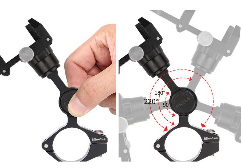 Особенности высокий борт дополнительное резиновое крепление поворотный механизм подвижная ножка диаметр крепления 22.2 мм -31.8 мм Материал : Алюминий