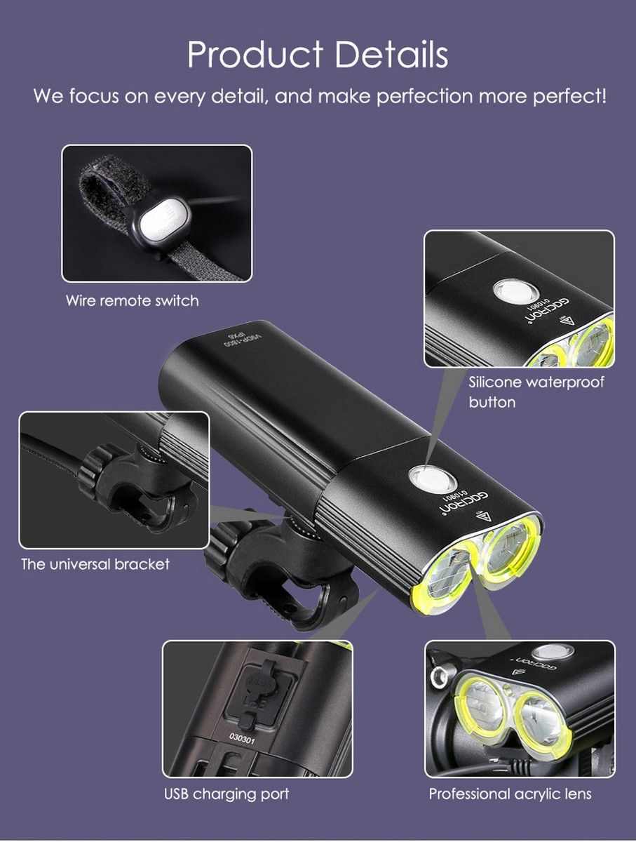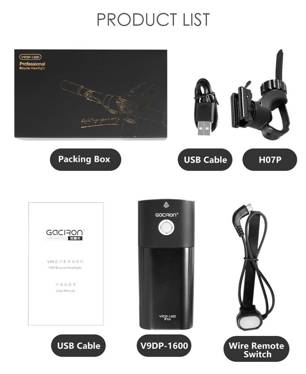 Передняя фара Gaciron V9D-1800 с максимальной яркостью 1800 люмен. Встроенный аккумулятор LG 6700 mAh, заряжается от Micro-USB. Время работы на одном заряде от 5 часа до 25 часов, время заряда 3,5 часа