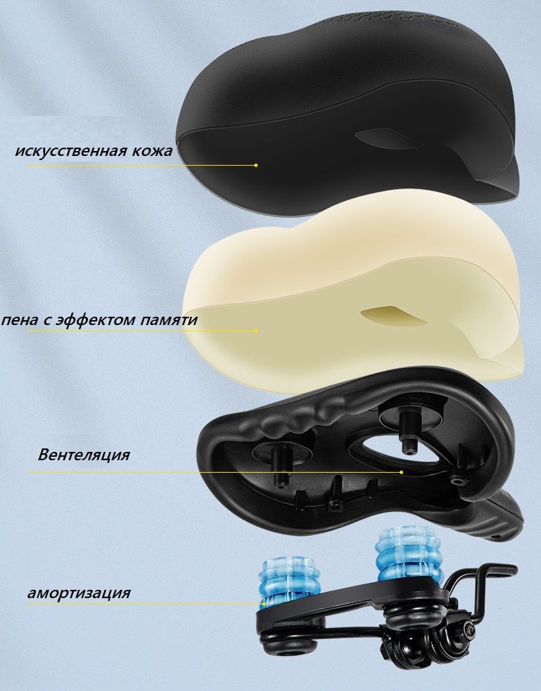 Широкое прогулочное седло с демпферами, сделает ваши поездки максимально комфортными. Вес: 706 гр Размер 230*260мм Наполнитель: пена с эффектом памяти Демпферы (пружины) для смягчения