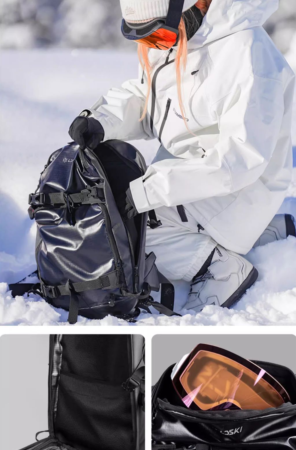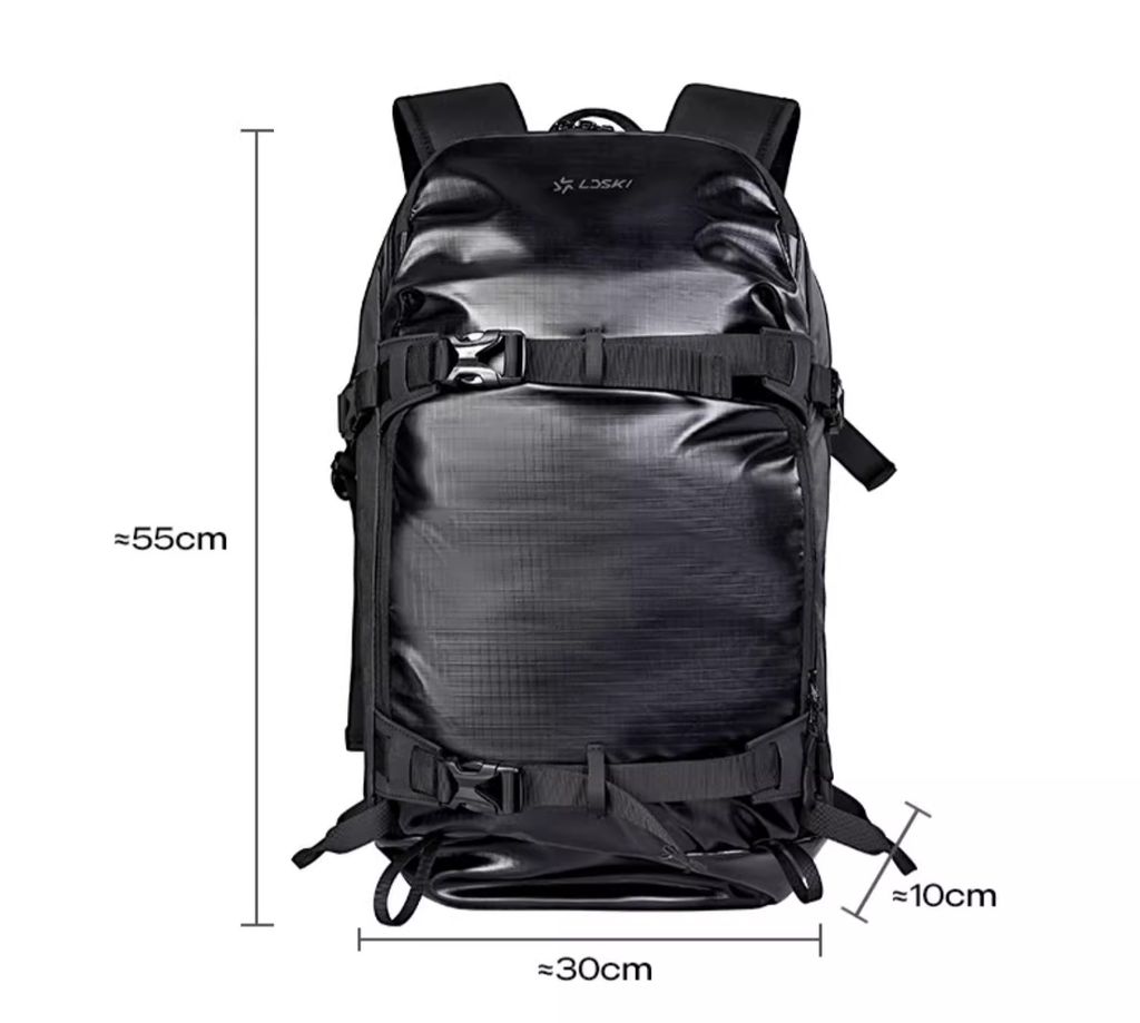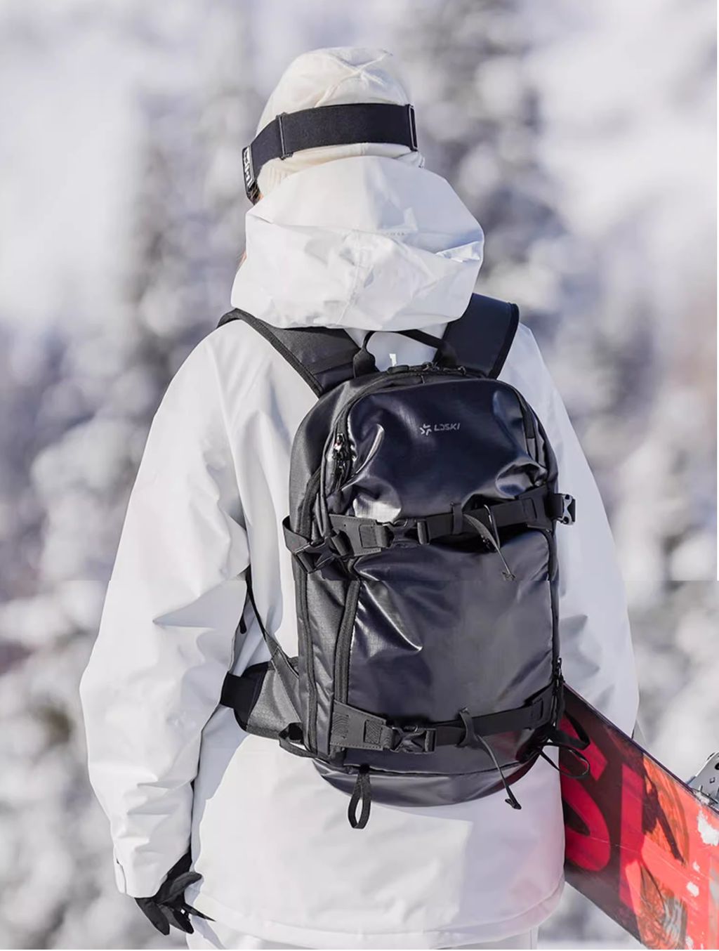 Рюкзака для катания на лыжах или сноуборде. Внешняя часть изготовлена из износостойкого водонепроницаемого материала. Качественная пластиковая морозостойкая фурнитура и молнии YKK.