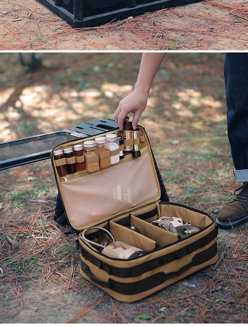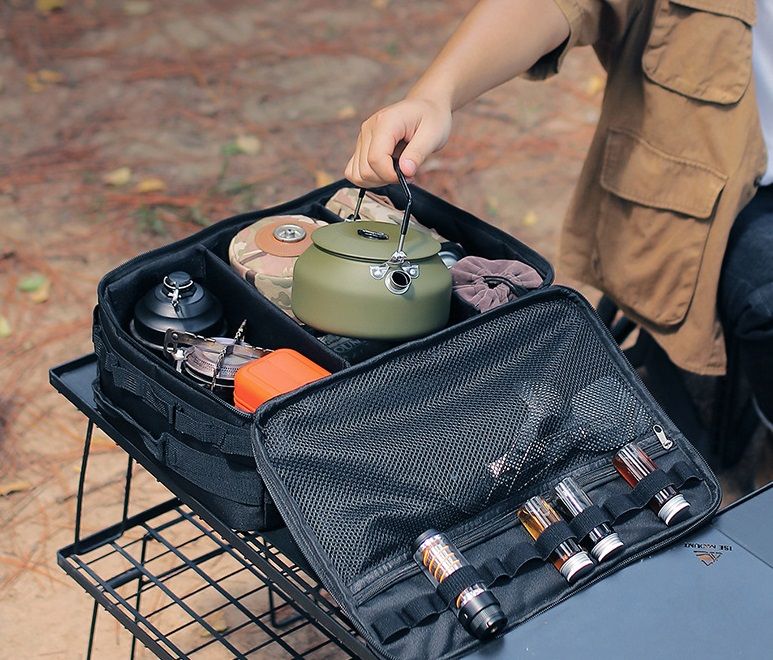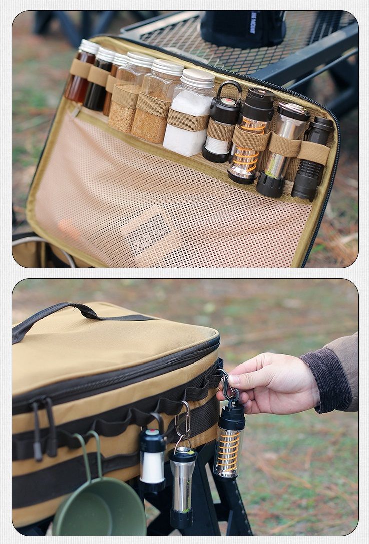 Сумка предназначена для улучшения комфорта при отдыхе на природе, облегчает сбор и использование туристического оборудования. У сумки имеются 3 перемещаемые перегородки, что позволяет настроить отсеки под ваши нужды. По периметру есть зацепы для разной мелочи, Нижняя часть выполнено из водонепроницаемого материала (TPU). Имеется боковой карман и сетка на крышке сумке.