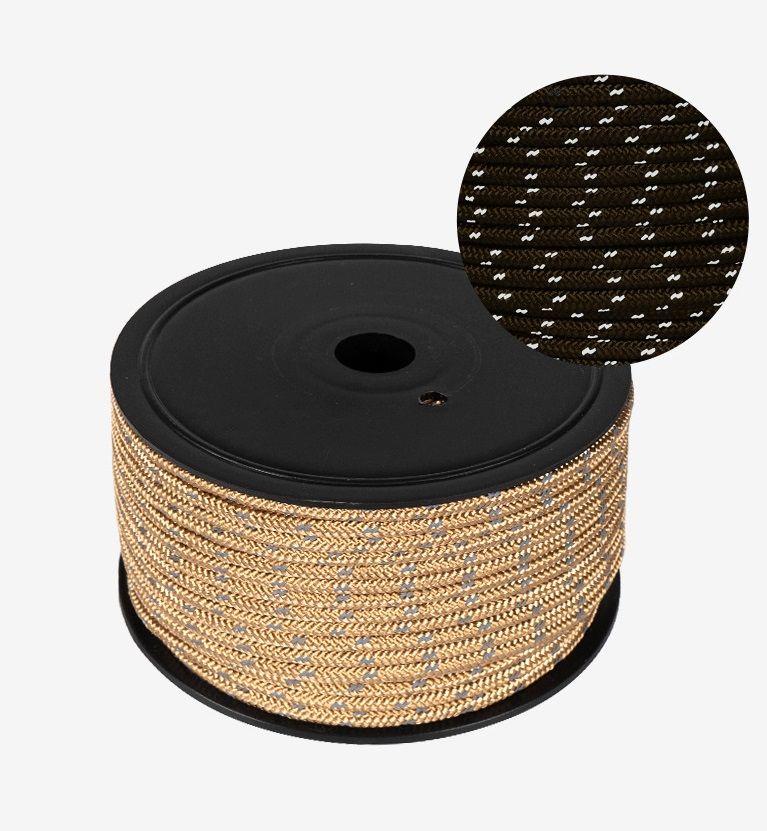 Моток 50 метров, диаметром 6 мм В веревку вплетена нить со светоотражающим элементом, делает веревку заметнее ночью.