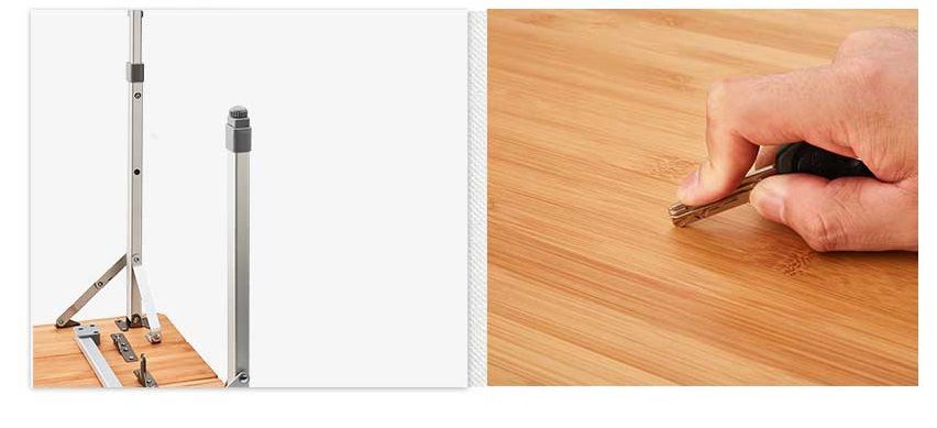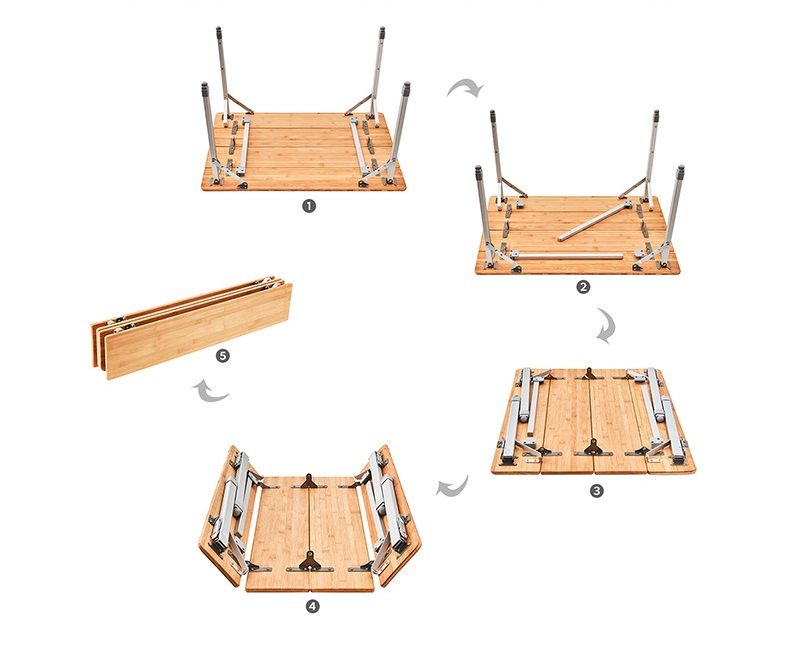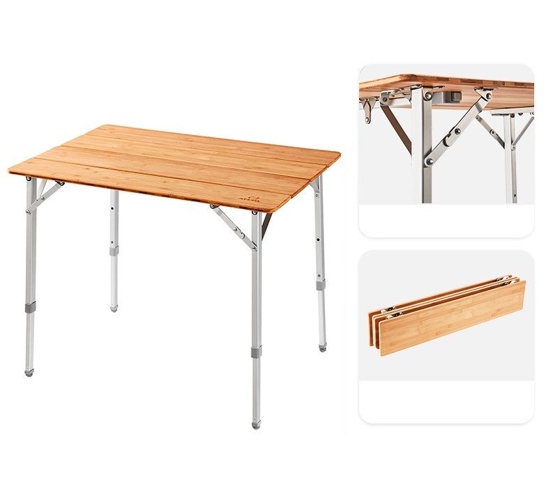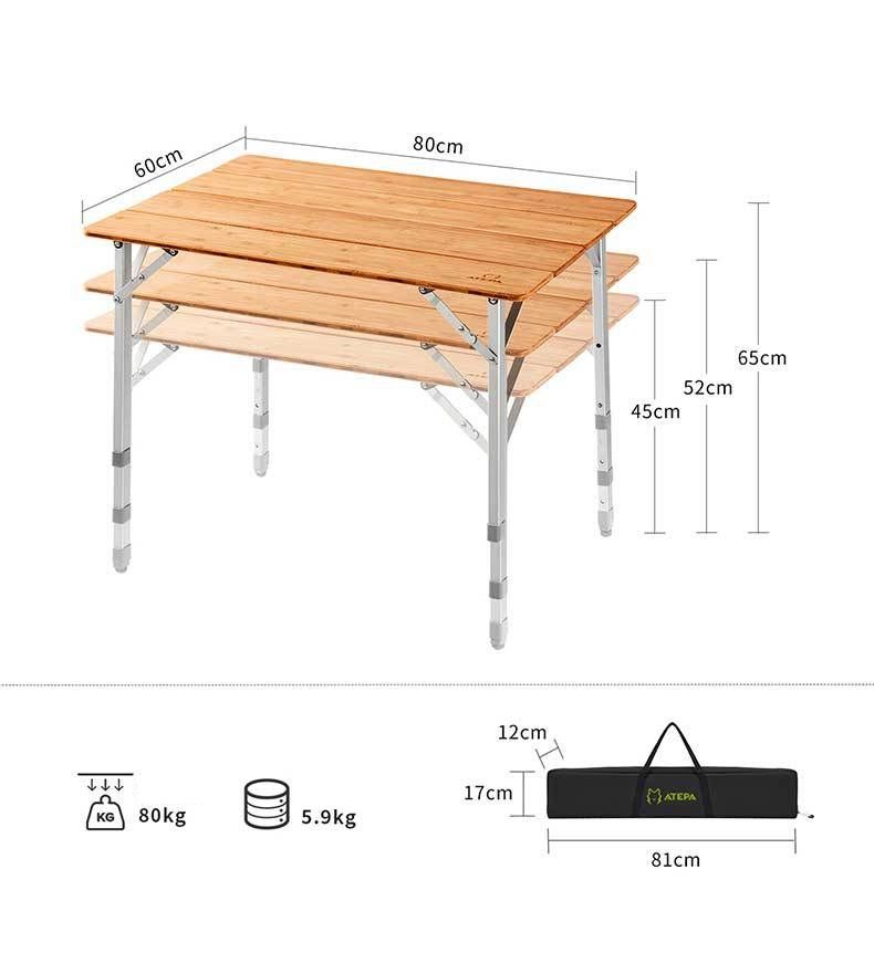 Складное алюминиевое подстолье и столешница из дерева Высота 45-52-65 см (регулируется) Размер: 60*80 cm Вес: 5,9кг Макс нагрузка: 80 кг (статическая) В сложенном состоянии: 81*17*12 см