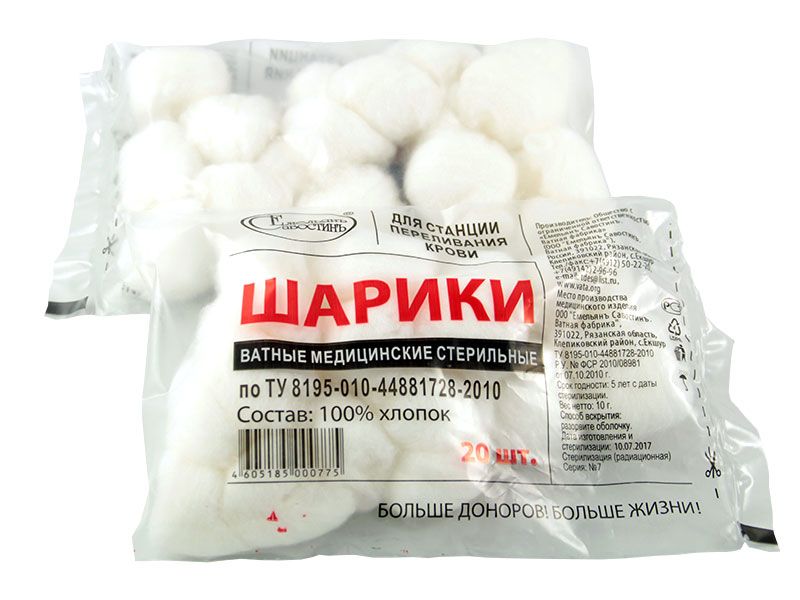 Шарики ватные №20 (10 г) медицинские стерильные (для станций переливания крови), Россия (Емельянъ Савостинъ. Ватная Фабрика)
