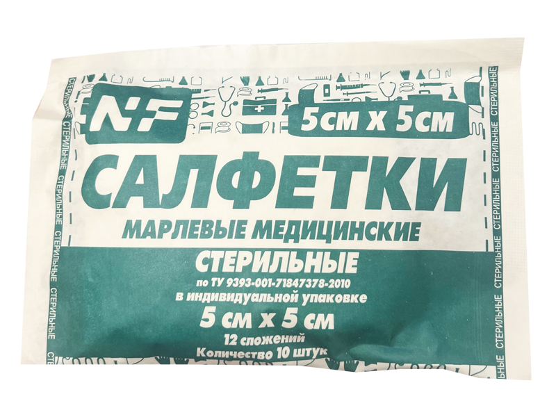 Салфетка 5,0*5,0 см марлевая медицинская, стерильная, 12 сложений, плотность 32 грамма, индивидуальная упаковка (мягкая), 10 штук/упаковка, Россия (ООО "Ньюфарм")