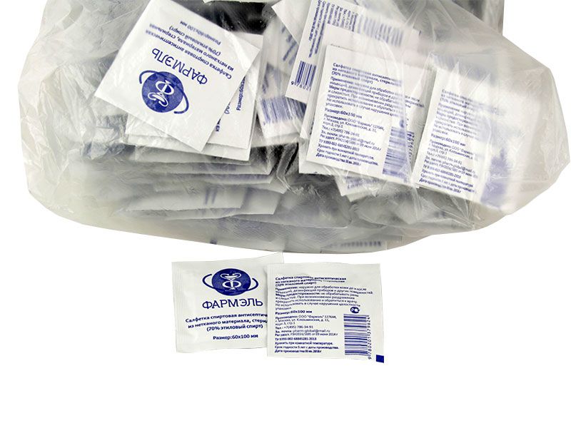 Салфетка спиртовая 60*100 мм (70% этиловый спирт) антисептическая из нетканого материала, стерильная, 300 штук/упаковка, Россия (ООО "Фармэль")