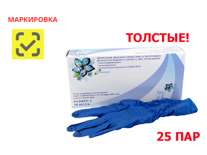 Перчатки диагностические (смотровые) из натурального латекса, нестерильные (текстурированные, повышенной прочности High Risk), размер L, 25 пар/упаковка, Малайзия (Top Glove Sdn.Bhd)