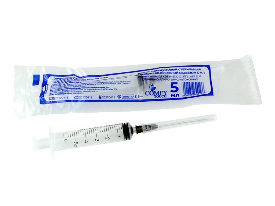 Шприц 5 мл (см3) с иглой 22G*1 1/2 (0,7*38 мм) Comfy Touch одноразовый стерильный (крепление luer slip), 100 штук/упаковка, Китай (Huaian City Hengchun Medical Products Co., Ltd)