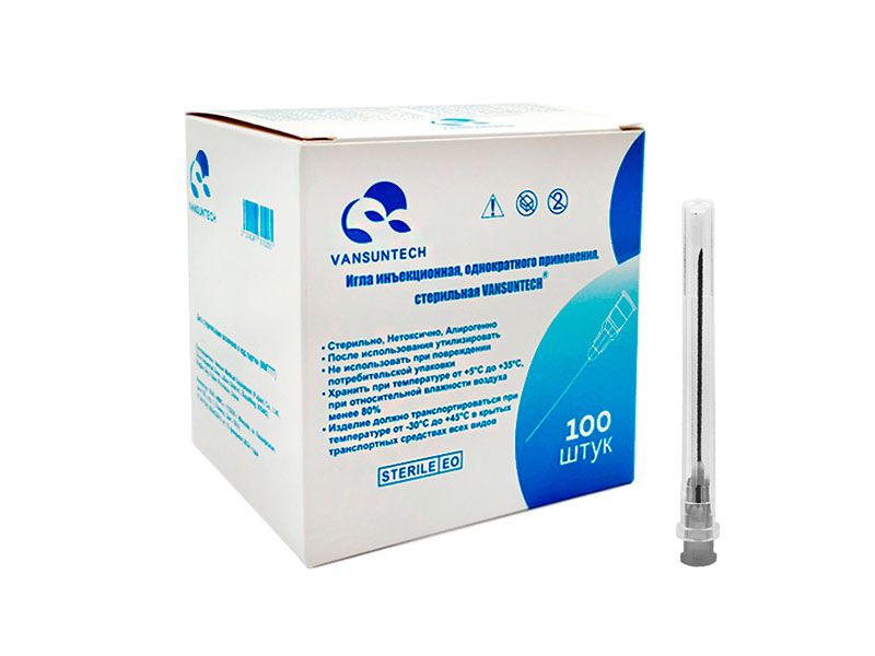 Игла инъекционная однократного применения, стерильная Vansuntech, размер 22G*1 1/2 (0,7*38 мм), 100 штук/упаковка, Китай (Vansun Medical Equipment (Fujian) Co., Ltd.)
