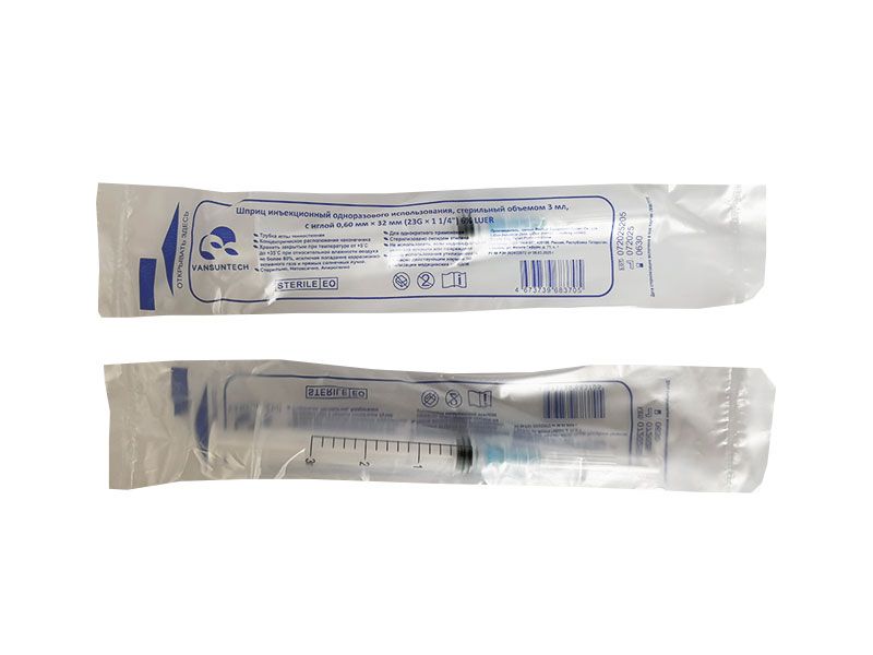 Шприц 3 мл с иглой 23G*1 1/4 (0,6*32 мм) инъекционный одноразового использования стерильный, 100 штук/упаковка, Китай (Vansun Medical Equipment (Fujian) Co., Ltd) 78445