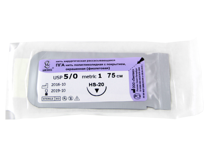 ПГА плетеный фиолетовый МР(1), USP(5/0), длина 75 см, игла обратно-режущая HS-20, 1/2 окружности, Россия (ООО "Линтекс") 11010В200750