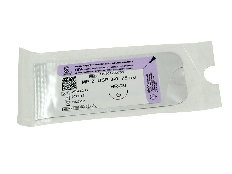 ПГА плетеный фиолетовый МР(2), USP(3/0), длина 75 см, игла колющая HR-20, 1/2 окружности, Россия (ООО "Линтекс") 11020A200750