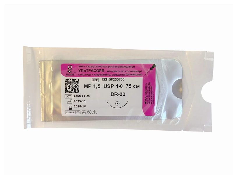 Ультрасорб фиолетовый, МР(1,5) USP(4/0), длина 75 см, игла колющая DR-20, 3/8 окружности, Россия (ООО "Линтекс") 12215F200750